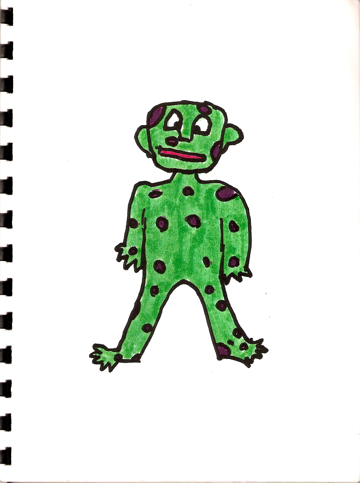 In the morning, I slipped quietly out of bed and tiptoed downstairs to Danny’s room.  The door creaked when I opened it, and I crept softly to his bed.  I slid my hand under the covers and tickled his feet.  He opened his eyes and stared blankly at the ceiling.  He didn’t laugh or say anything.  I figured he was putting on an act.  Then I saw it!  A small green and purple polka-dotted, well, thing, climbing out of Danny’s ear.
